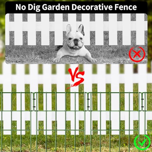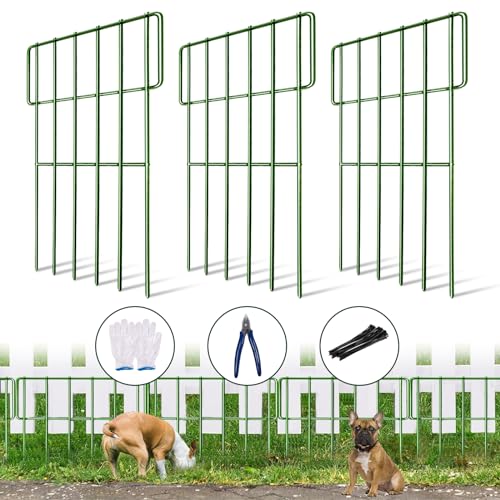 ?ANIMAL BARRIER FENCE KIT?You will get a 10 Pack animal barrier fence, 1 wire cutters a pair of gloves, and 30 cable zip ties. The diameter of fence rod has increased by 25% and Decorative fence is more sturdy. 2inch Spike Spacing fence?More effective at blocking small animals from entering your garden . Each decorative garden fence is 13 inches long and 17 inches high. There are 10 fences, the total length is about 10.8 feet.