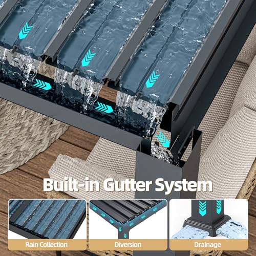 ?Built-In Drainage System?A built-in hidden drainage system channels rainwater away when the louvers are fully closed. Water flows through integrated roof gutters, down inside the hollow posts, and exits through the bottom, preventing standing water, leaks, and overflow while keeping your patio area dry
