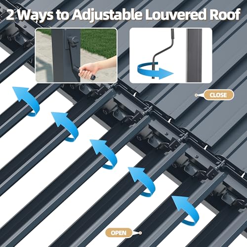 ?Dual Adjustable Louvers with Upgraded Side Crank Control?Featuring two independently adjustable louver sections, this louvered pergola allows each side of the roof to be controlled separately from 0° to 90°, giving you full control over shade, sunlight, and airflow. In addition to the traditional long adjustment rod, an upgraded side short-rod crank is included for easier, more convenient operation. Both control methods can be used to open and close the louvers