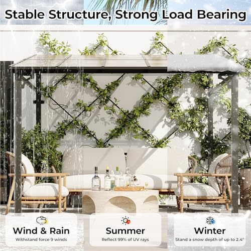 Efficient Rainwater Drainage: The wall mounted gazebos pergola adopts wavy panels with grooves and bumps that drain water quickly and ensure that rainwater does not accumulate on the roof of the wall pergola, ensuring a pleasant outdoor experience
