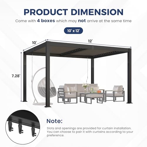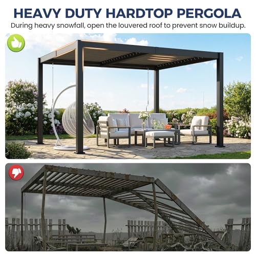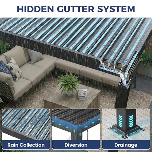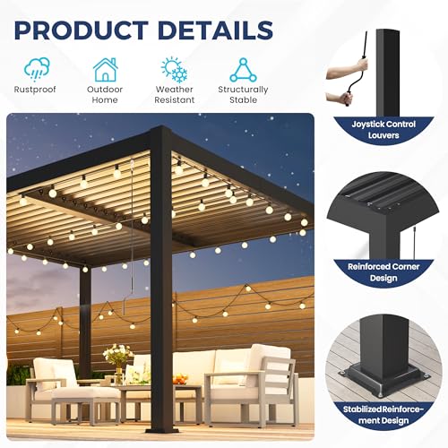 ?Versatile Adjustable Roofs?- Featuring two independently adjustable metal roofs, our pergola allows you to easily control the amount of sunlight and shade over an area of up to 192 square feet. Adjust the roof from 0°to 90° to enjoy the perfect balance of sun and shelter, suitable for all your outdoor gatherings, be it parties, BBQs, or quiet family time