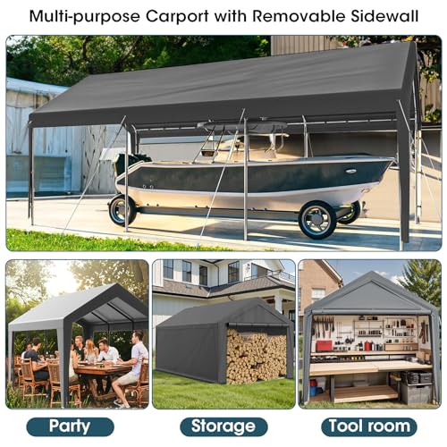 Stability: this car port is supported by eight heavy-duty galvanized metal poles. And equipped with connectors, elastic ball strap, ground stakes to provide extra support, and keep your heavy duty carport stable in windy and snowy days