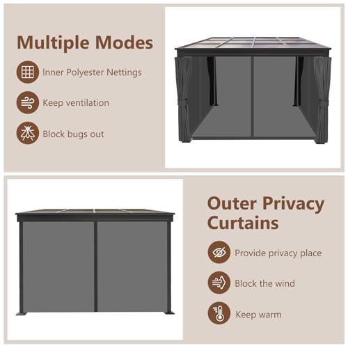 Netting & Privacy Curtains - The hardtop gazebo is designed with double-sided zippers, double rail system, and double sidewalls fully enclosed. In the summer netting can be used to resist mosquito bites while keeping cool and ventilated; ensures good ventilation and open views. In winter, close the curtains, and you will get a warm private space; fully enclosed shell protects you from rain and UV rays while adding more privacy.
