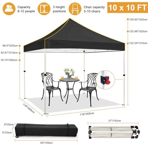 Large Capacity and Easy to Carry: Our heavy duty canopy provide 96.87 square feet of space, and the one person set up pop up canopy can accommodate 4 tables or 7-8 people at the same time.The easy up canopy 10x10 and its four sidewalls can be easily folded and stored in a wheeled carrying bag, convenient for transportation and storage in the car trunk. The 10x10 pop up canopy helping you make the most of portable freestanding shelter for your outdoor activities