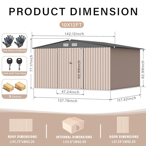 SPACIOUS STORAGE SPACE - The 10×12 FT outdoor storage shed measures 142.12 inches in length, 117.52 inches in width, and 77.17 inches in height. The metal storage sheds is designed to meet all your outdoor storage needs. This durable metal garden shed provides ample space for storing lawn mowers, ladders, tool kits, and other items, helping to keep your yard tidy. Additionally, you can enhance its functionality by purchasing storage racks that can be easily mounted on the shed walls