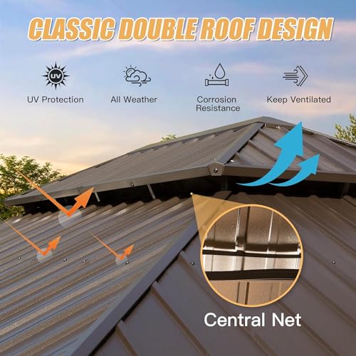 ?Durable Frame?Pavilion gazebo is made of cedar wood, which is naturally resistant to rot, decay, and insect damage, making it an excellent choice for outdoor structures that need to withstand the elements. Cedar gazebo with its sturdy and durable galvanized steel double roof design, is built to withstand extreme weather conditions while providing excellent ventilation and UV protection.