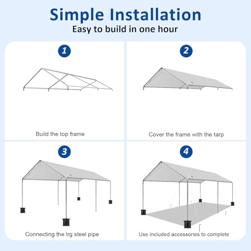 Easy to Set up: One person can complete the installation of the carport within an hour, and it is recommended that two people install it faster and with less effort