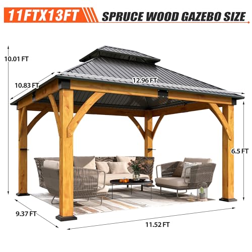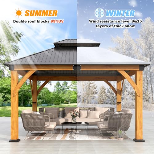 Upgraded Spruce WOOD Frame: Wooden hardtop gazebo is made of FSC certified 4.7x4.7 inch spruce wood. We advocate ecological sustainability when making this wooden gazebo, seamlessly integrating your terrace or backyard with outdoor space. Compared to cedar wood, it has stronger durability, strength, and crack resistance, and supports all-weather use.