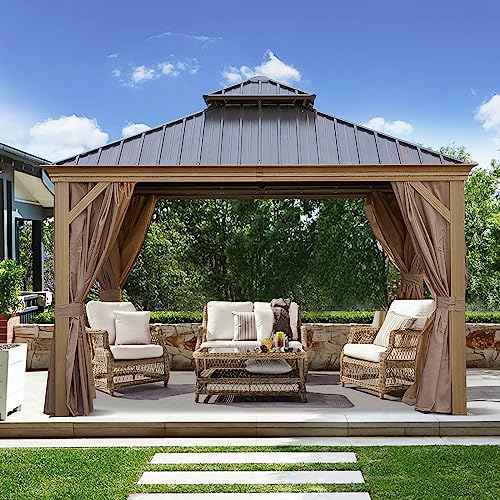 ?WOOD GRAIN FRAME?- This outdoor gazebo features a sturdy and durable aluminum structure with a natural wood-like appearance achieved through thermal transfer printing.This gazebo for patios will bring a sense of nature to your outdoor space.This provides excellent protection against scratches, peeling, corrosion, and rust, ensuring a long service life.