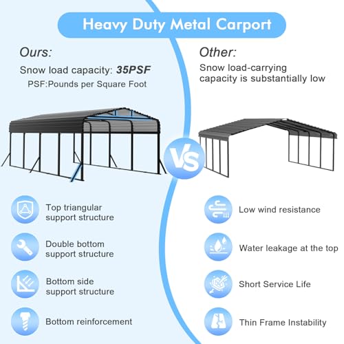 Reinforced Metal Carport Structure? - This heavy-duty 12x20FT metal carport features triangular roof reinforcement and extended eaves for optimal rain runoff. The galvanized steel roof paired with a powder-coated frame ensures lasting durability against UV rays, hail, and snow, while reinforced ground anchors enhance stability
