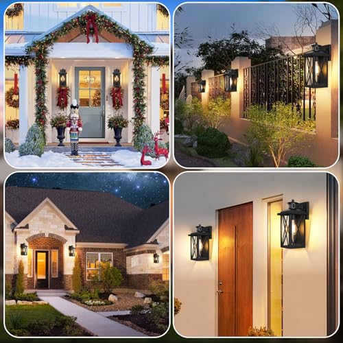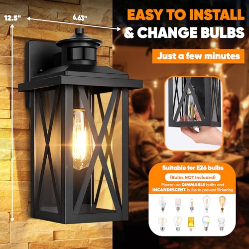 Hassle-Free Mounting and Easy to Use: Upon receipt, you'll find well-assembled 2-pack outdoor wall lanterns, then only a few steps to get your upscale home decor. In addition, the thoughtful open-bottom design makes it easy to replace bulbs and clean the glass. And, the standard socket is compatible with all E26 base bulbs. As the motion/dusk dawn modes show different brightness, please use DIMMABLE bulbs (Not Included).