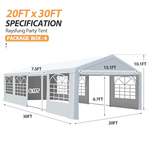 QUALITY SERVICE: The tent for party is packed by 4 boxes and comes with detailed installation instructions. If you have any question with Raysfung 20'x 30' heavy duty party tent , please let us know, we will give you an answer.