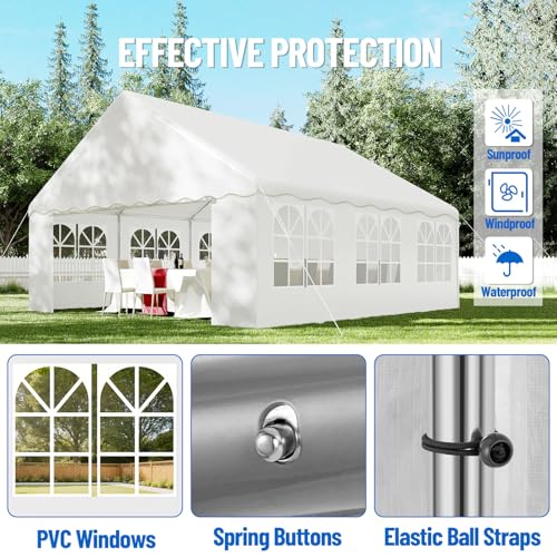 Heavy Duty Party Tent: This outdoor party tent made of thickened upgraded galvanized steel tubing for the frame, with a powder-coated surface for rust and corrosion resistance, and durability in rain and wind to ensure a long life and safety, and we provide enhanced accessories to secure the party canopy's stability and wind-resistant.