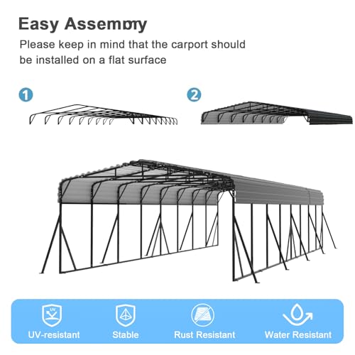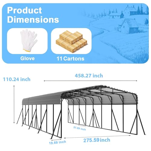 Secure & User-Friendly Design:This heavy-duty metal carport features six side support rods and ground anchors for enhanced base stability. All sharp edges are covered with soft rubber guards, and heavy-duty gloves are included to protect your hands during installation.