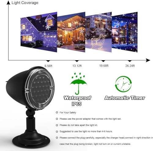 ?Safe User-Friendly Design?:Snowfall led light with UL/CE/GS/SAA/PSE safety certificated.Gentle soft led light, better to protect eyes especially for kids,it can work normally on rainy days. But don't soak it directly in water. In hot summer or cold winter, snowfall lights can work normally.