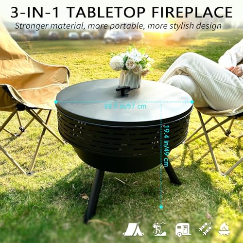 3-In-1 Fire Pit: The fire pit is equipped with a cooking grate, a lid and one poker Enjoy the roast and bonfire by fixing the grill to the fire pit. Specially designed handle for easy lid closing. With 3 uses (bonfire, barbecue, and table) for your garden, patio, or yard that you can use all year round.