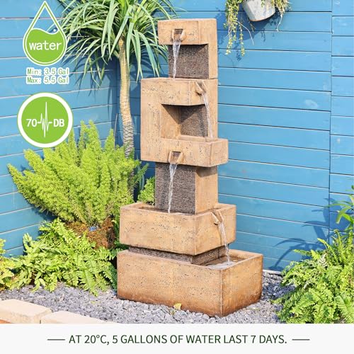 RELAXING WATER FLOWING: Water Cascading Down The Imitates The Sound Of A Real Waterfall, Bring A Tranquil Ambience To Your Outdoor And Indoor Spaces, While The Soothing Sound Of Water Helps Relieve Fatigue. Water Sound Up To 70 dB And Needs 3.5 Gallons To Make The Garden Fountains Outdoor Works.