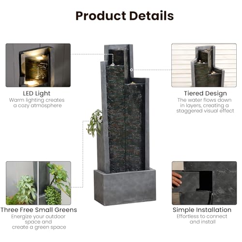 Outdoor Water Fountain with Lights: The waterfall fountain indoor comes with built-in LED lights, the cascading design makes the flowing water soothing and vivid, and the soft glow from the lights creates a relaxing atmosphere, adding a touch of elegance to the porch, backyard, garden or lawn.