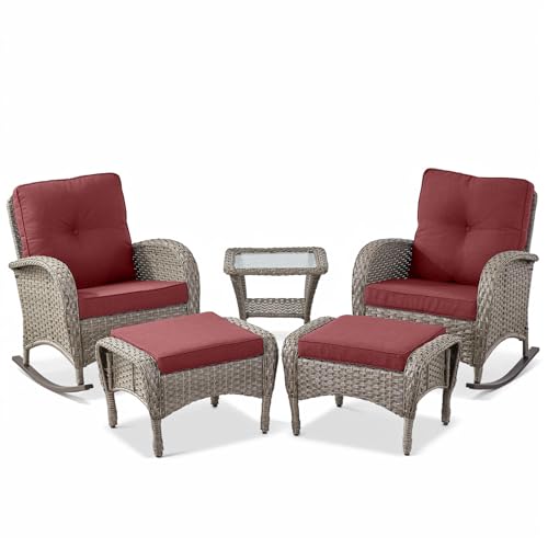1.PATIO ROCKING FURNITURE SET DETAILS: The 5 pcs patio furniture set includes 2 wicker rocking chairs, 2 ottomans and 1 glass top side table. Patio Rocking chair dimension W28.5*L33*H33.5 inches, weight capacity 300 lbs. Patio glass side table dimension W19.7*L19.7*H19.7 inches, weight capacity 50 lbs. You'll love the addition of this charming patio rocking chair for porch that will make a big difference in your outdoor relaxation space.
