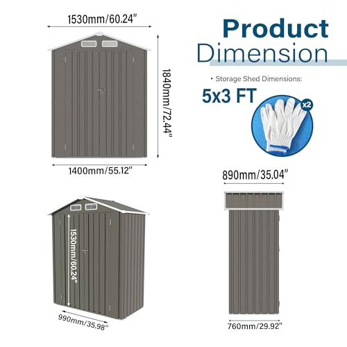 [IDEAL SIZE, EFFICIENT STORAGE]5x3 feet (approx. 60.24 x 35.04 x 72.44 inches) compact design, perfect for balconies, patio corners and limited space. This multifunctional outdoor storage shed easily accommodates gardening tools, sports equipment, bicycles and daily sundries. The interior space can be fitted with shelves and hooks for organized and categorized storage, keeping your outdoor space neat and organized and making full use of every inch of space.