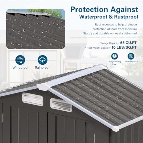 [High-quality metal material, durable] Made of pre-painted galvanized steel with multiple anti-rust treatments for excellent weather resistance and corrosion resistance. Equipped with a sealed waterproof roof and wind-resistant structure, compared with wooden or plastic storage sheds, the metal material has higher strength and durability, and is not easy to deform, crack and fade.