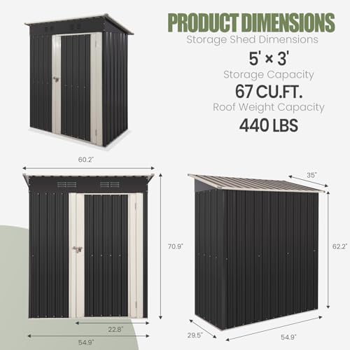 SPACIOUS CAPACITY: Measuring 60.2'' L x 29.5'' W x 70.9'' H, this 3x5FT storage compartment provides plenty of room for storing shovels, lawnmowers, bikes and toy cars to keep your belongings organized. This backyard shed can be used as a garden storage, pet shed or trash enclosure, etc., is a good addition for storage.