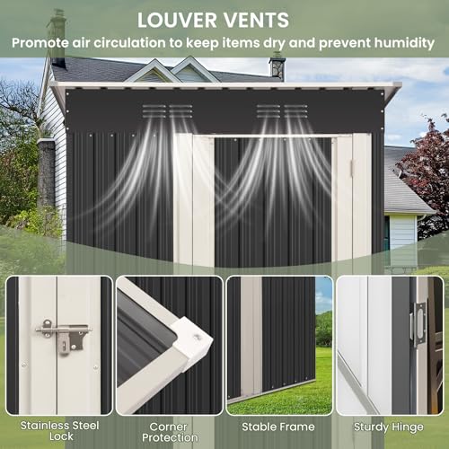 LOCKABLE DOOR AND VENTILATION: The lockable door ensures security against tool theft and prevents small animals from accidentally entering (lock not included). The strategically placed vents in this outdoor storage shed enhance internal airflow and maintain a breathable environment. Provides convenience and greater security for your stored items.