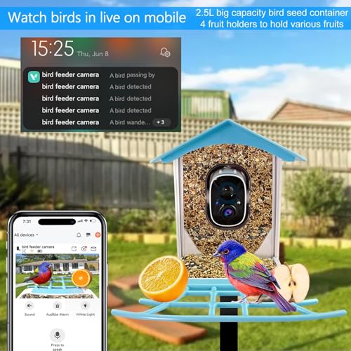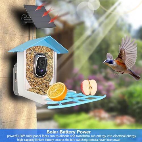 ?????7 Features in 1?1. Solar Powered; 2. 2.4G WiFi; 3. 2K 3MP HD camera; 4. AI identify +10,000 Bird Species; 5. Microphone & Speaker in smart bird feeder with camera solar powered; 6. 2.5L Seed Container in bird house camera; 7. 145° Wide Angle HD Lens in camera bird feeder solar powered.