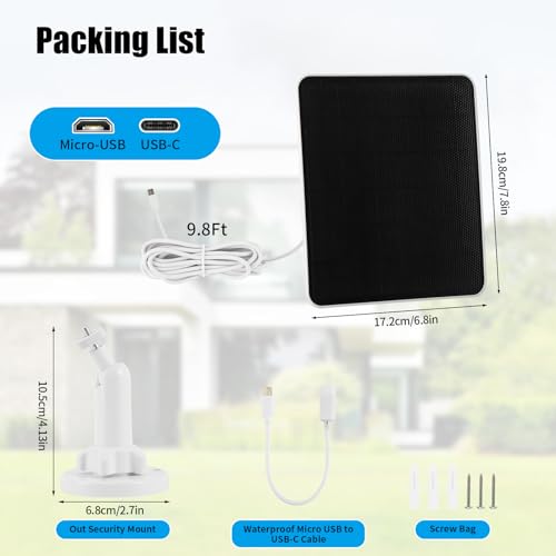 ?Packing List?1*6W solar panel, 1*360° adjustable wall mounting bracket, 1*screws bag, 1* USB-C waterproof converter, 1*manual