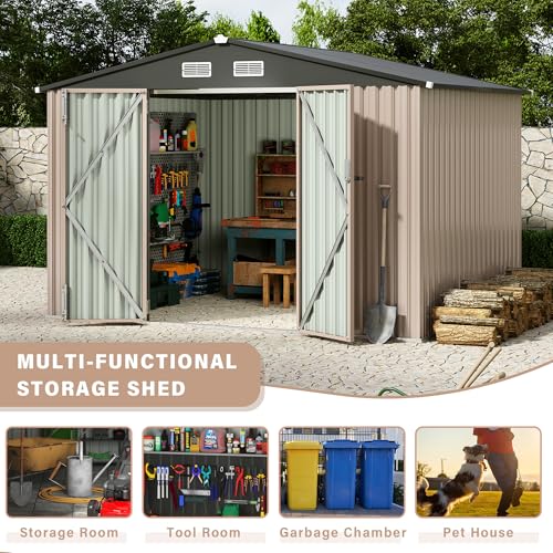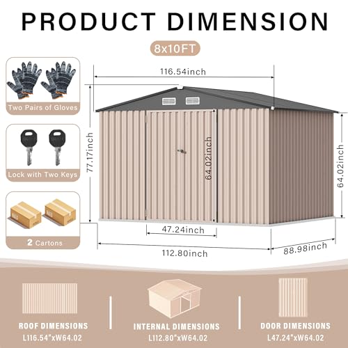 SPACIOUS STORAGE SPACE - The 8×10 FT outdoor storage shed measures 116.54 inches in length, 88.98 inches in width, and 77.17 inches in height. The metal storage sheds is designed to meet all your outdoor storage needs. This durable metal garden shed provides ample space for storing lawn mowers, ladders, tool kits, and other items, helping to keep your yard tidy. Additionally, you can enhance its functionality by purchasing storage racks that can be easily mounted on the shed walls