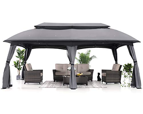??GREAT-QUALITY VENTED TOP?: Our double vented roof patio gazebo is designed to enhance air circulation and strengthen wind resistance,which makes you feel relaxed and comfortable. The fabric of top cover is made of 500D polyester, all stitching lines are sealed, waterproof, 99% UV protection and fade resistant, with CPAI-84 fire retardant certification. The drain hole at the top is designed for helping drain, on rainy days, water won't gather and crush the frame.