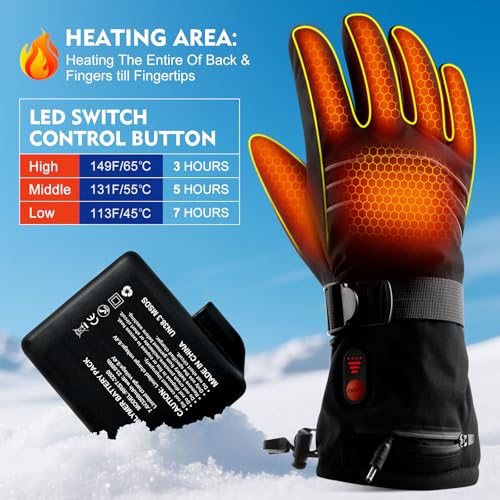 Temperature Adjustable Heated Gloves: ABXMAS gloves adjust temperature from 113-149 ? according to personal preference and ambient temperature and of approximate heating times of 3-7 hours, to keep your hand warm at an ideal temperature in cold winter