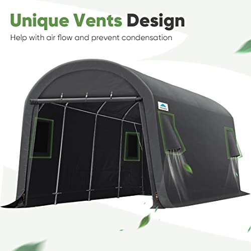?Heavy Duty Durable Frame??1-1/2-inch diameter steel poles provide stability and strength to make the storage shelter carport safer. The garage storage tent is equipped with upgraded 0.32X11.81 inch (8X300mm) L-Type pegs, thickened and enlarged to increase stability.