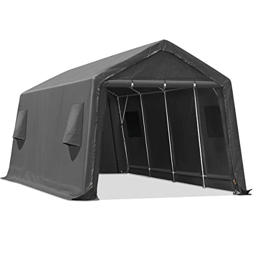 ?Heavy Duty Durable Frame??1-1/2-inch diameter steel poles provide stability and strength to make the storage shelter carport safer. The garage storage tent is equipped with upgraded 0.32X11.81 inch (8X300mm) L-Type pegs, thickened and enlarged to increase stability.