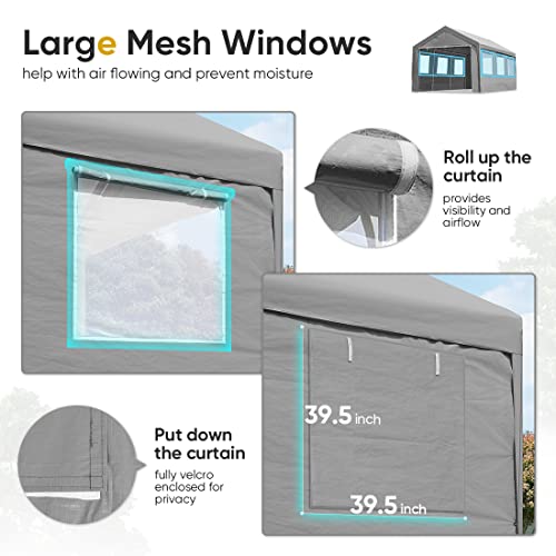 ?Ventilation Windows with Roll-up Window Cover?- The garage tent is designed with 6 large mesh windows in the sidewalls, helping with airflow and preventing moisture. Each window equips a window cover outside to roll down for privacy or windproof.