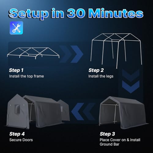?Heavy Duty Durable Frame??1-1/2-inch diameter steel poles provide stability and strength to make the storage shelter carport safer. The garage storage tent is equipped with upgraded 0.32X11.81 inch (8X300mm) L-Type pegs, thickened and enlarged to increase stability.
