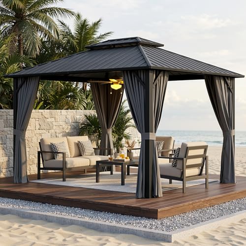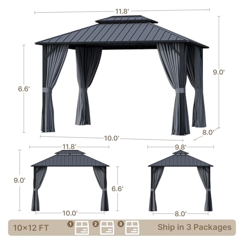 Easy Setup Design: This outdoor gazebo features a rust-resistant aluminum frame with pre-drilled holes for accurate alignment during assembly. Numbered hardware bags make it easy to build your 10x12 hardtop gazebo on patios, decks, or even soft lawns—simply secure it with the included bottom screws for a rock-solid hold on any surface