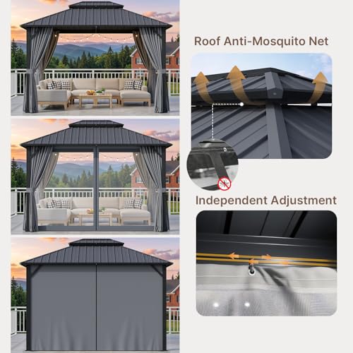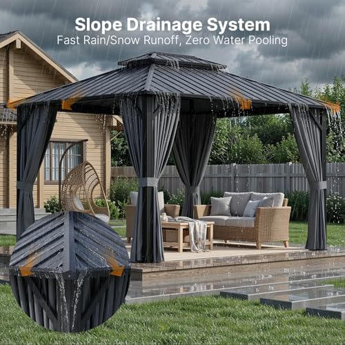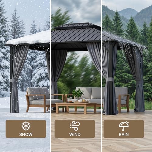 Double Galvanized Steel Roof: The hardtop gazebo features a double galvanized steel roof designed to withstand rain and snow. Pre-sealed seams help reduce moisture penetration, making it a durable outdoor canopy for backyard gatherings and daily use