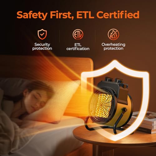 Overheat Protection and ETL Certificate: Safety first! The thermostat maintains constant warmth, preventing overheating and nighttime discomfort; ETL certified, this small garage heater guarantees reliable safety for your family; a perfect solution for safe and cozy indoor heating