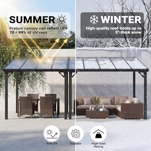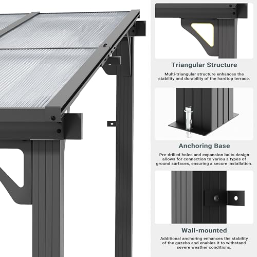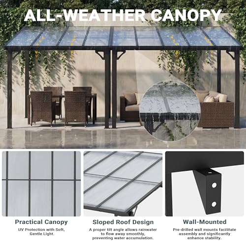 [Storm-Proof Sloped Design] The wall-mounted gazebo features an angled roof that accelerates rain runoff, draining twice as fast as flat-top designs to prevent pooling. It works seamlessly as an awning, a modern outdoor patio structure, or reliable patio cover for shade and rain, blending protection with clean architectural lines