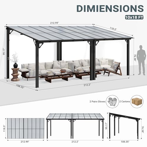[Sturdy Aluminum Frame] The 10x18 outdoor pergola features a reinforced aluminum frame and triangular support structure for exceptional stability. Engineered to handle heavy snow and strong winds, it provides reliable shelter in harsh weather conditions. When securely anchored with the included expansion bolts and ground stakes, it stands firm as a durable and steadfast outdoor structure