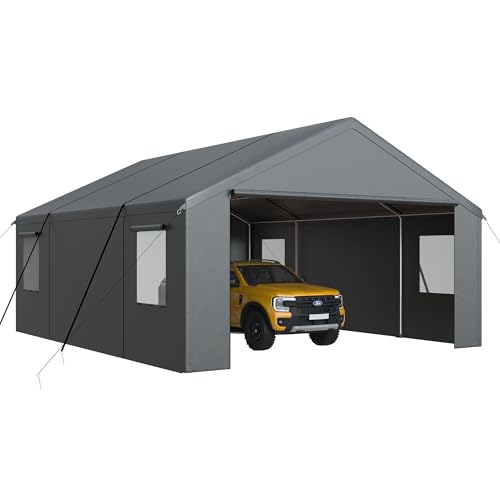 ?Large Portable Garage?This 13x25 feet heavy duty carport is suitable for trucks, SUVs, RVs and tractors. Lightweight and durable, it is flexible to relocate to your backyard, farm or job site, providing plenty of space for your vehicles, boats, cargo and more. Removable sidewalls and doors allow for a variety of your needs. Ideal not only for vehicle storage, but also great for parties, trade shows, outdoor events, weddings, storage sheds and more.