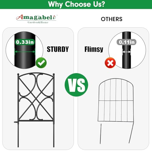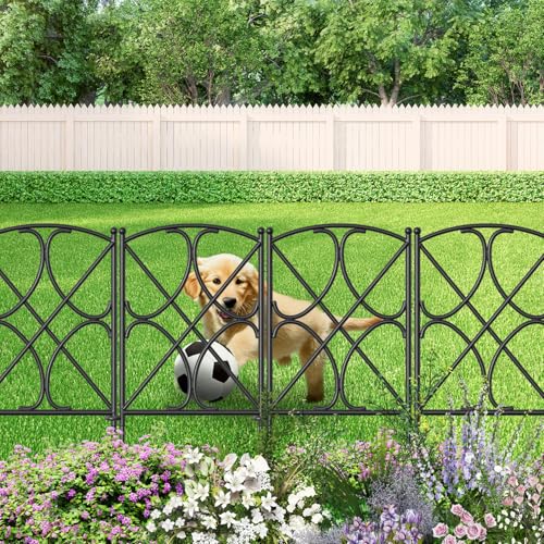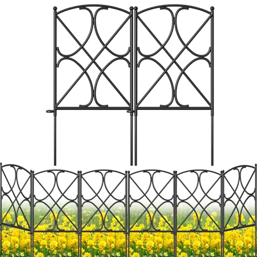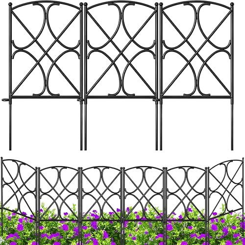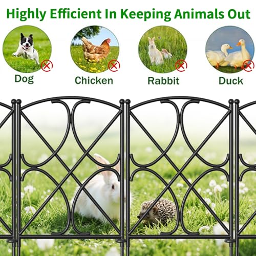 SIZE & RUSTPROOF MATERIAL: Decorative metal garden fence with single panel size 24" high x 12" wide,10 Panels in total.This metal fence panels for front yard is made of black Iron with vinyl pvc powder coated surface will enable you to use the garden fence outdoors durably; Rustproof and durable for outdoor using yard garden beds, garden fence border garden edging and dog fences animal barrier.