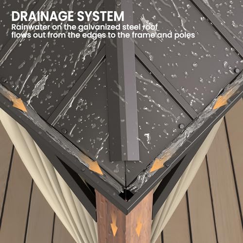 ?????GALVANIZED STEEL DOUBLE ROOF?Fade-resistant and rust-resistant galvanized steel top, keeps out bright light and harmful UV rays, makes this HARDTOP GAZEBO strong enough to withhold heavy snow and wind. The double-layer roof offers great ventilation and airflow. The middle of roof has 2 hooks that can be hung with electric lights or fans to boost your pleasant outdoor time.
