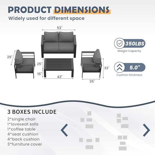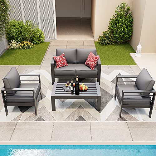 ?????UPGRADED ALL-ALUMINUM FRAME?: This modern patio furniture set is made of a premium aluminum frame, which is both strong and lightweight. Compared with ordinary iron/steel furniture, the aluminum outdoor patio furniture set is anti-fade, anti-rust, anti-corrosion in all kinds of weather. It will last you for years to come!