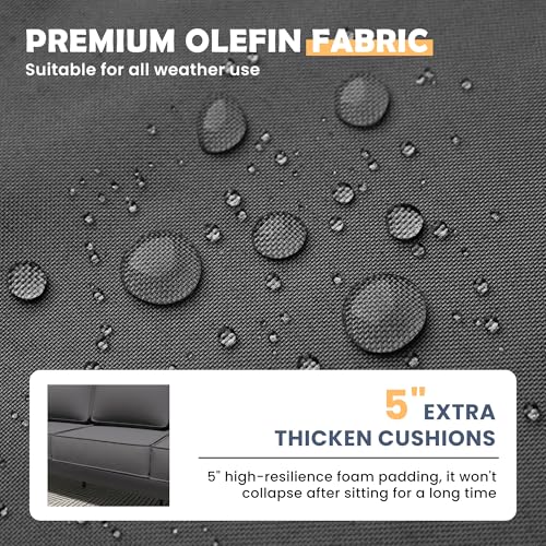 ?????5 INCH OLEFIN SEAT CUSHION?: Our patio furniture set comes with 5-inch thick cushion, the cushion cover is made of upgraded Olefin fabric which is soft, breathable and fade-resistant. The high-density sponge can reduce the tiredness when sitting for a long time and let yourself be immersed in a comfortable environment. With a zipper design, the cushion cover is removable.The bottom of the cushion is designed with anti-skid particles, which can ensure that it will not slide away when sitting.