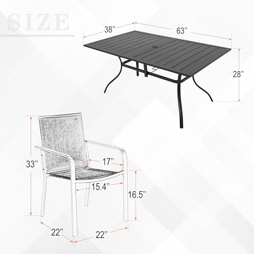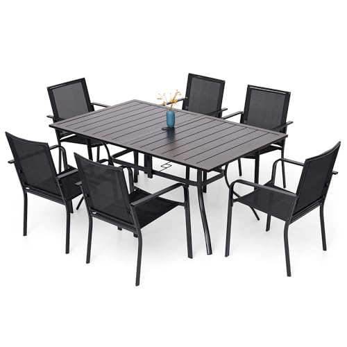 COMPLETE SET: 7-piece outdoor dining set includes a spacious 63 x 38 inch rectangular table and 6 matching stackable chairs with black textilene fabric