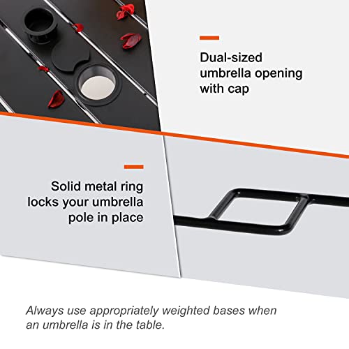 PRACTICAL FEATURES: Table includes umbrella hole for shade options, curved leg design for stability, and accommodates up to 6 people comfortably