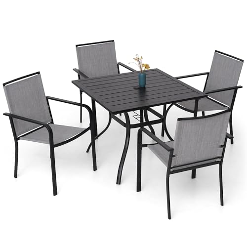 COMPLETE SET: 5-piece patio dining set includes a 35-inch square table and 4 matching stackable chairs with brown tan textilene fabric