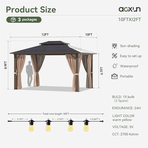 Outdoor String Lights:Users can decorate your gazebos with the latest LED string lights that are energy-saving and able to greatly cut electricity costs. Featuring 15 sockets and 16 shatterproof LEDs (including a spare), the lights can endure long time use. A high waterproof rating of IP65 makes patio lights durable enough to withstand harsh weathers. Besides, the string lights can be paired with dimmer switches (not included) to enhance lighting flexibility and create a gentle glow